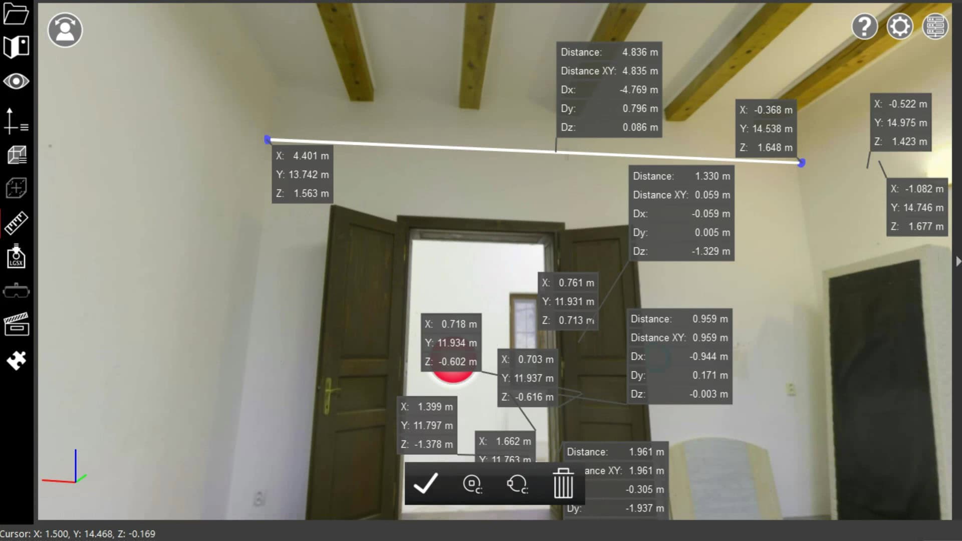 Vysoká přesnost a hloubka detailů naskenovaného objektu vám umožní pohybovat se prostorem digitálního modelu, jako byste byli přímo na stavbě a odměřovat vzdálenosti, úhly, plochy nebo průměry, a to vše v pohodlí vaší kanceláře.
